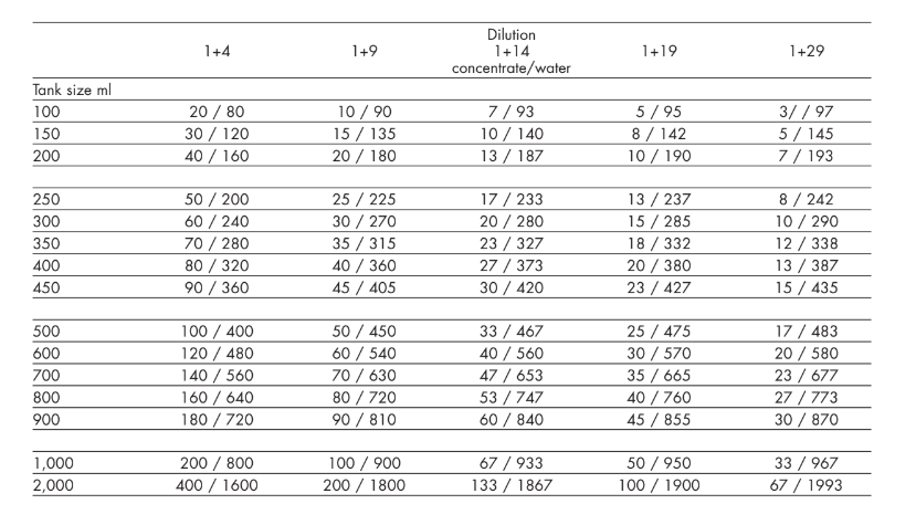 Dilute 1:3. Dilute 1:5 for longer developing times and increased film speed.