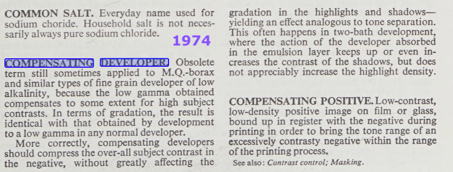 Notes on acutance and compensating developers. The exposure latitude of current emulsion permit such wide tone scale that there is room for considerable variation (errors) of exposure. Exposure can be used to move the subject tones up or down. Compensating developers were well suited to earlier emulsions with less latitude. Similarly, acutance developers came into wide, almost exclusive use with earlier roll-film emulsions.