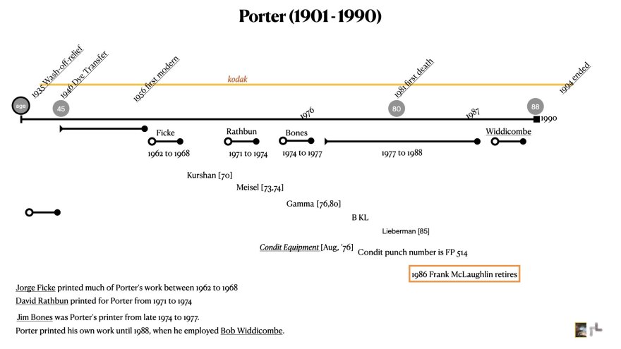 The painter Jorge Fick (b.1932 -2004) printed much of Porter’s work between 1962 to 1968. David Rathbun (b.1943- 2020)printed for Porter from 1971 to 1974. Jim Bones (b.1943–)was Porter’s printer from late 1974 to 1977. Porter printed his own work until 1988, when he employed Bob Widdicombe (b.1949 –).[ as of July 2021 ]