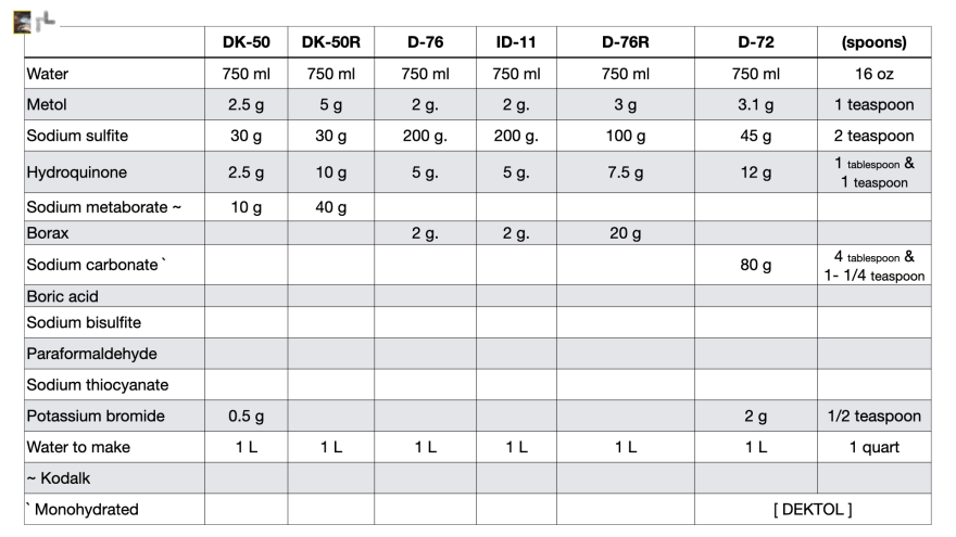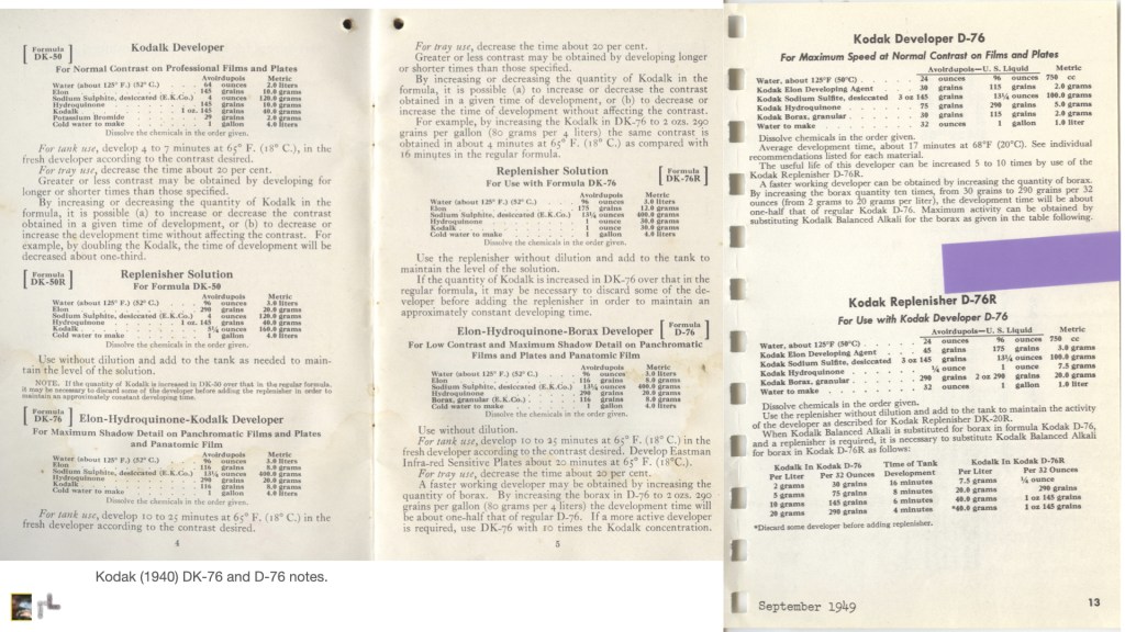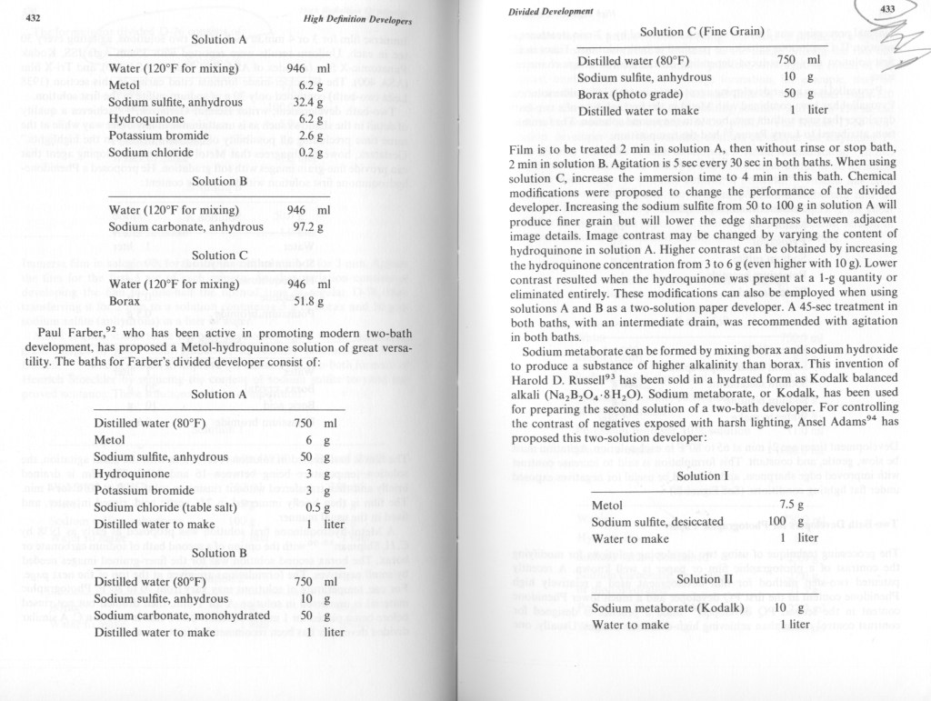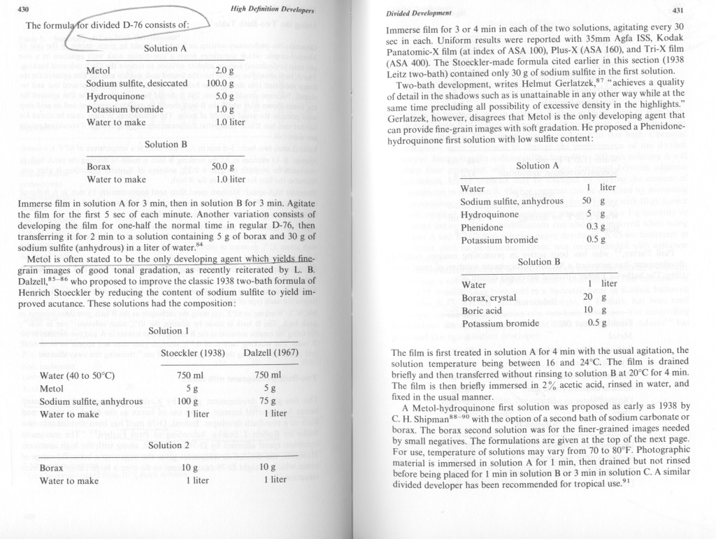 Turn D-76 into a divided, two-step, developer. Solution B is borax. This is a good procedure for other developers even off the shelf ones. Kodak’s Kodalk was sodium metaborate which has higher alkalinity than borax. This form of bath ‘B’ is a great benefit in controlling (compensating) for hard (high contrast) subject lighting. See the above page copies for specific formulas.