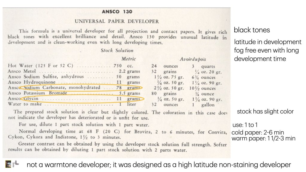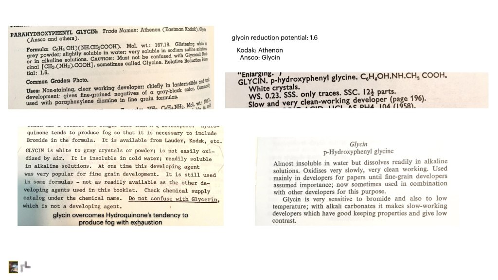 This: “With some papers glycin gives a light “stain” to the very high values and  this appears as a “glow” which I have found rewarding at times. Usually a slow-working developer, glycin is sometimes preferred when a considerable number of prints are to be developed together.” Ansel Adams, The Print