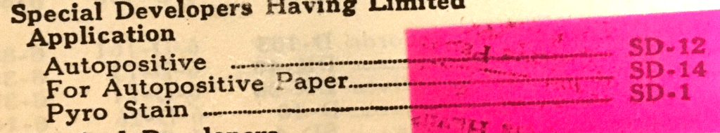 1948: Kodak lists SD-1 for pyro stain. SD means special developer; little use. Kodak needed a tanning developer (they had one) but they didn’t want stain.