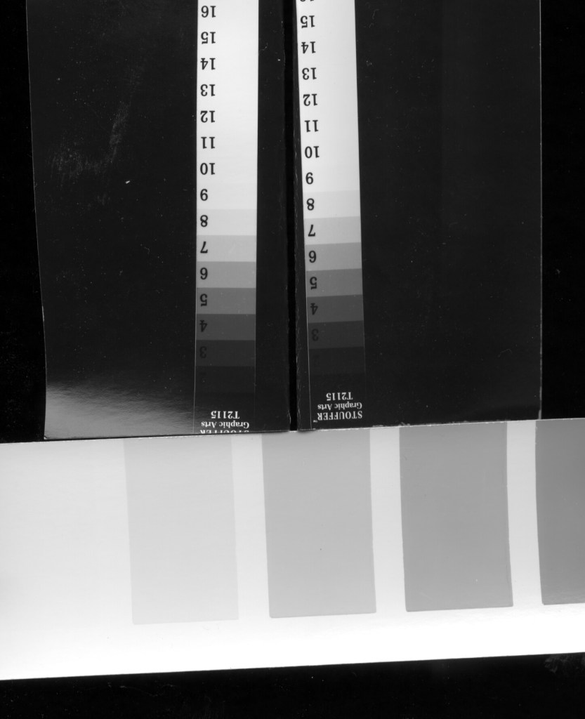 I begin with making a step test to determine the first white of the paper. The result of my test is shown in the bottom left image. Those steps were made in quarter stop increments.