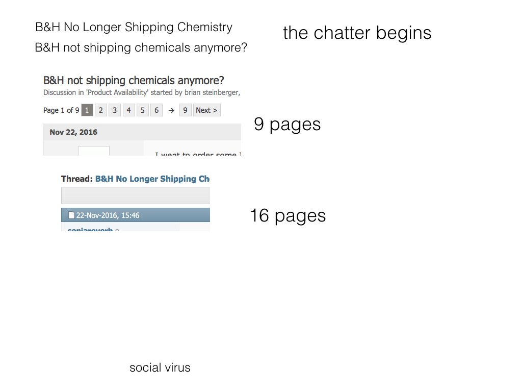 B&H has returned to shipping some chemicals. Their online representative (via APUG) asserted they didn’t change from a long standing process. This statement was easily, directly in conflict with many of the thread participant’s experiences. Mine too: Nov 16 I can buy X,Y,Z – Nov 22 those products can only be purchased in the store. Then, after several weeks, my phone calls, (others probably as well) B&H added back many of the darkroom chemicals. They have not added all back. I estimate that of 130 chemicals available in November 2016, 17 are no longer considered shippable by B&H.