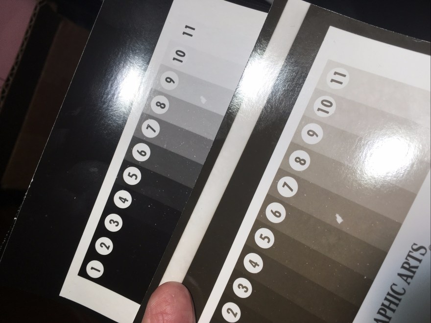 This is a photo of Unibrom atop a piece of MGFB – that’s the paper with the torn edge. I can clearly see the difference in tone and density between Unibrom and MGFB. These papers were exposed to a stouffer wedge, then processed at the same time in Dektol (1:1) for 2 minutes. (in the background, out of focus, are other test sets for other setups in process)