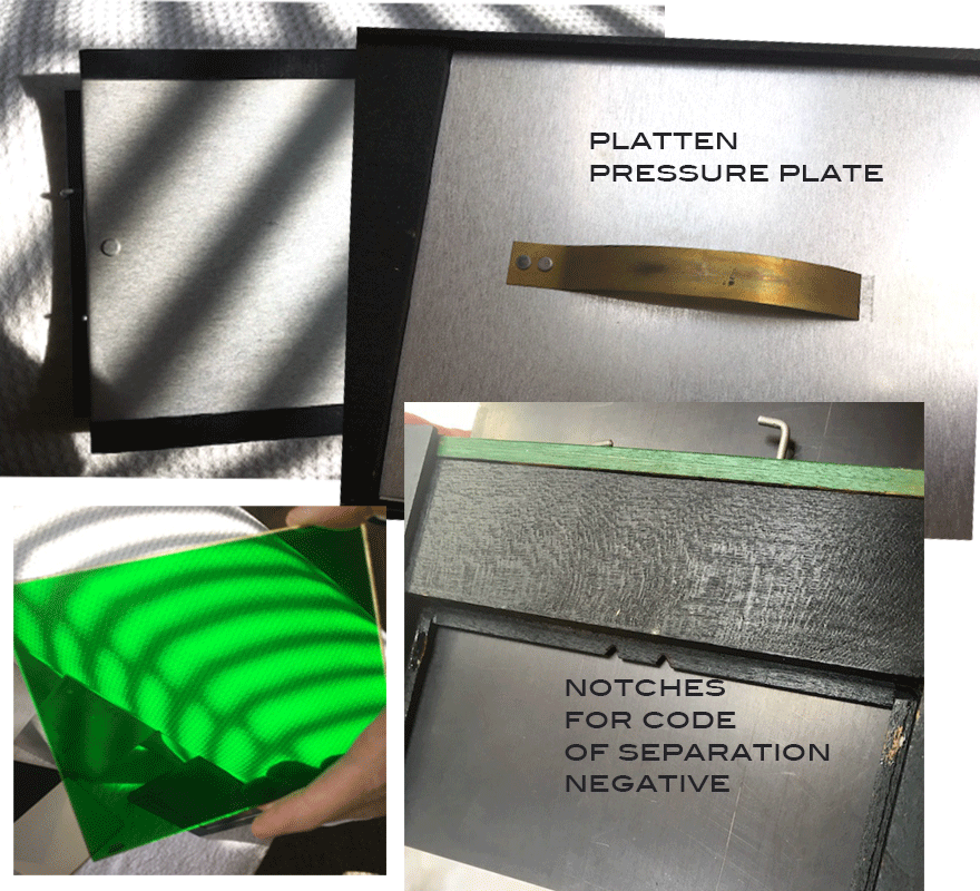 In the picture on the left [‘two size tabs], we see what seems a typical 4×5 film holder. Except, when looking at it edge on, there is a ‘green’ edge, as well as a ‘silver’ back (instead of another slide). The other set of pictures show the elements of this ‘Green’ separation holder. The back slide discloses a platen, pressure-plate that holds the film toward, and against the separation filter (this one is green). You can also notice the notches for coding the separation negative. Those two ‘v’ cutouts would make 2 dark edge marks onto the film. After developing, you would see these on the edge of the film and know which separation this sheet was. Each color has a different notch code.