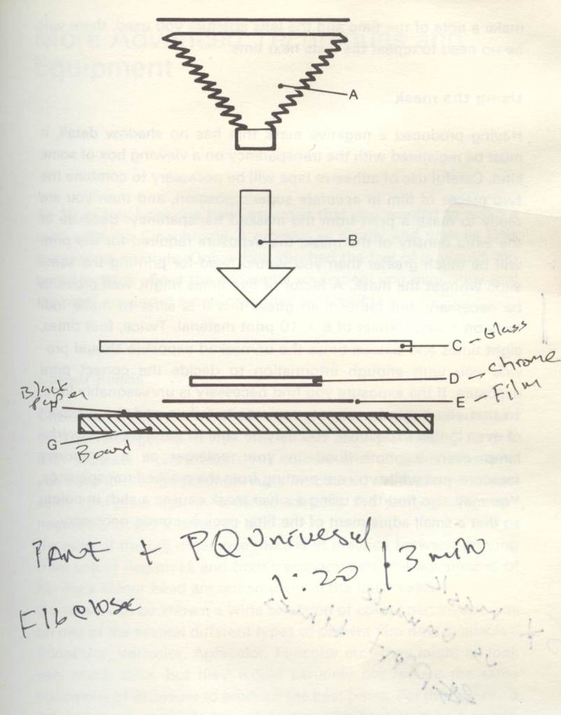 Use Ilford PanF film. Ilford PQ Universal developer. Arrange the stack as illustrated. Set the enlarger as if you were making an 11×14 print using your suggested lens. Follow the start points indicted in the drawing.