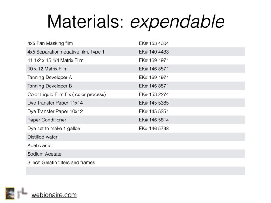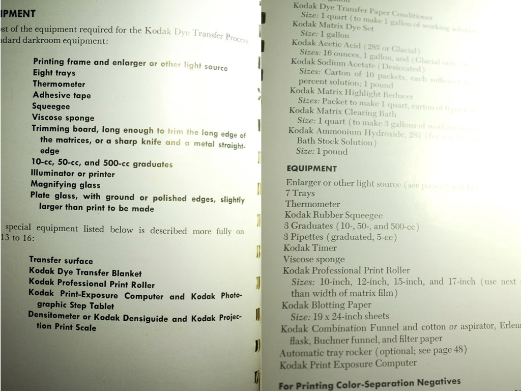 The equipment needed listing from two different issues of the Kodak Dye Transfer guide. These are from the 50s, as the process went from a maybe to the main way of printing from color. Dye Transfer rapidly replaced Carbro, becoming the preferred way for print publishing — advertising, in fact all media.