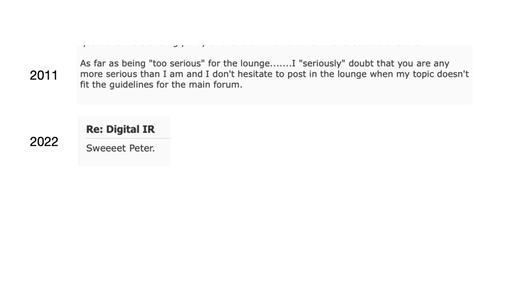 Seriously, this forum did discuss things in the “lounge” the members only area that goog/bots don’t browse. Why topics are brought into the large open net isn’t known to me. In the case of this forum of declining membership, they began allowing small format, even digital postings as long as they didn’t involve ‘technical’ discussion. This should mean that they are only allowed to discuss imagery; no tech talk. Sure enough these threads have exploded in length, however, as you should expect, the discussions are about the lens, camera, filter, software… that is, they are technical. These members stumble over anything other than process or purchase.