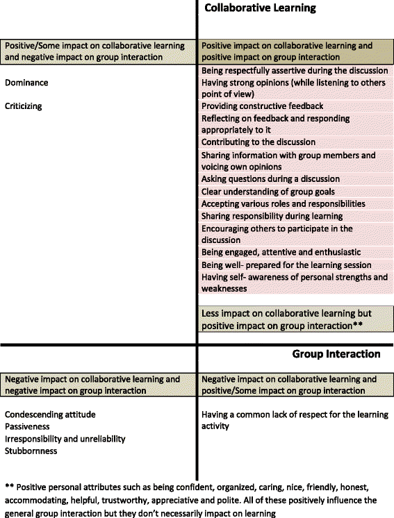 Students and tutors identified a range of behaviours that influenced collaborative learning. The main themes that emerged included: respectfulness; dominance, strong opinions and openness; constructiveness of feedback; active listening and contribution; goal orientation; acceptance of roles and responsibilities; engagement and enthusiasm; preparedness; self- awareness and positive personal attributes. An important finding was that some of these student behaviours were found to have a differential impact on group interaction compared with collaborative learning. This information could be used to promote higher quality learning in small groups.’