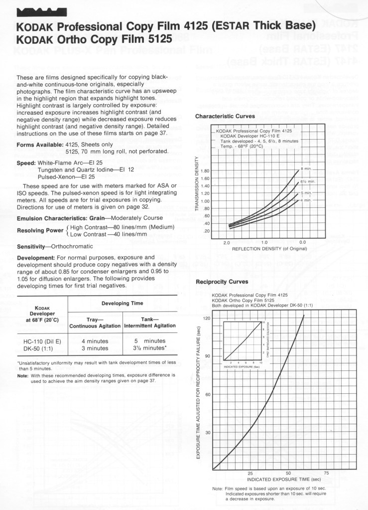The exotic developer is HC-110 (Dil E). This film was used indoors, I used it at tungsten settings, EI:12. It was also used as a lab film, in darkroom using enlarger light. Read the guidance about exposure and control of highlights. That is why it could be used in a masking system, and in duplicate negative making, although, I used dupe negative film for that: made it a one-step process.
