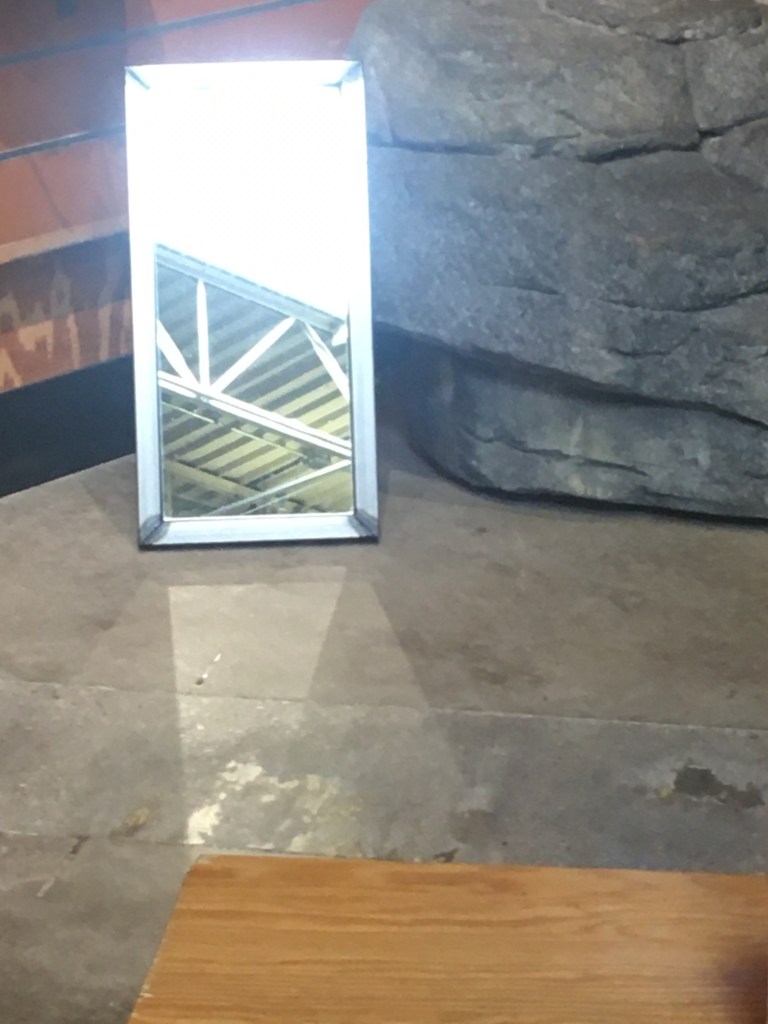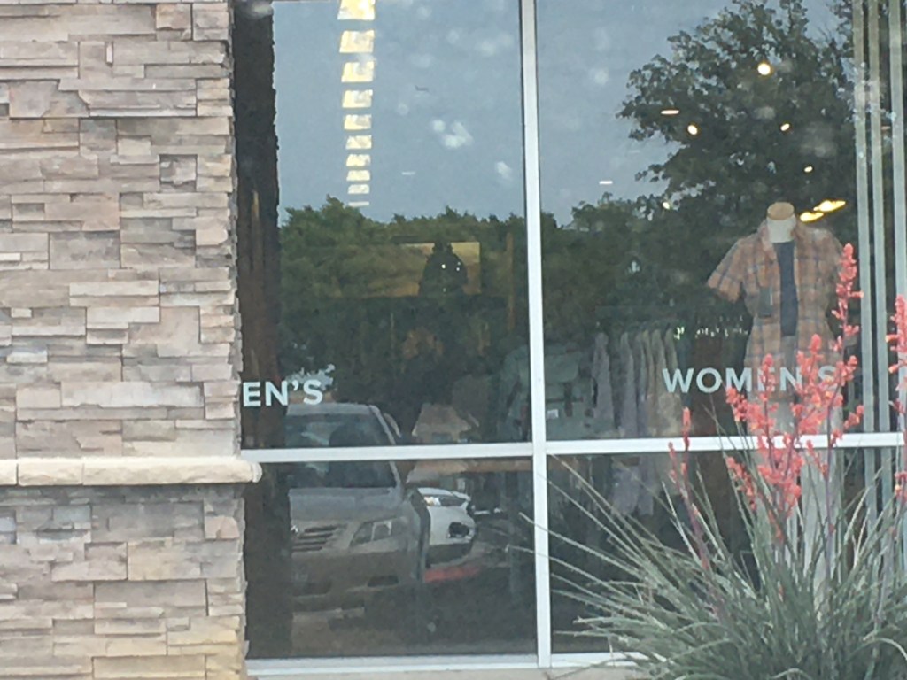 Inside, a mirror and shop display. It must be something. Feels like it, because of the light patterns. As I adjust my position things arrange themselves. Three tries. I’m tempted to move the mirror; even the bench. I don’t. This isn’t a studio shot. If it were, I’d feather the lights. Make changes to the surface of the mirror. Dulling spray applied locally.